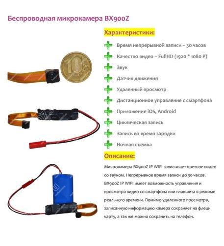 | Беспроводная микрокамера IP WIFI BX900Z | Пишет видео и звук на карту памяти SD транслирует видеосигнал по радиоканалу (WIFI). Сигнал может приниматься непосредственно по WIFI соединению, либо передаваться удаленно - по интернету, в том числе и мобильному 3g 4g в любую точку мира. Работает без подзарядки АБ 20ч. Пишет видео при зарядке АБ. |